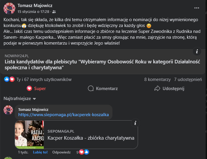 Tym samym „Super Dzielnicowy” zachęcił, by środki przeznaczone na płatne głosowanie przekazać na leczenie ciężko chorego Kacperka Koszałki. Gest ten spotkał się z ogromnym uznaniem mieszkańców.