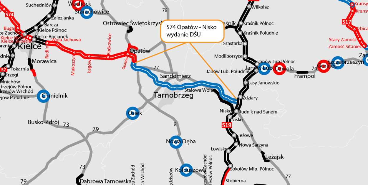 Nowa S74 ma strategiczne znaczenie w skali kraju. Połączy bowiem S12 w Kozeninie (pomiędzy Sulejowem i Opocznem) z S19 pod Niskiem, stając się najkrótszym szlakiem łączącym centrum Polski z Podkarpaciem.
