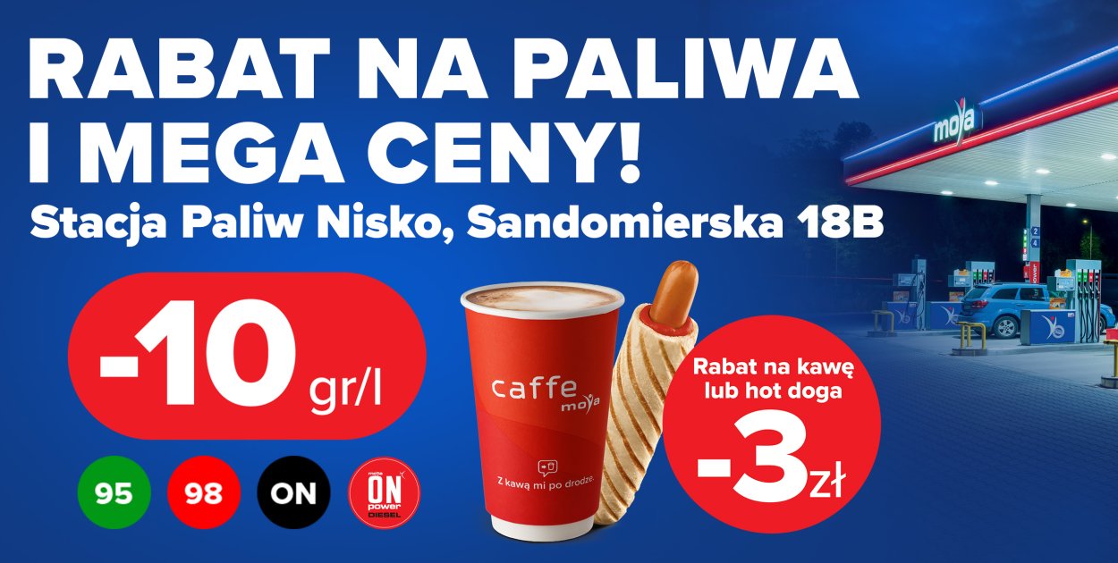 Od 1 października do końca grudnia br. kierowcy tankujący w Nisku mogą liczyć na spore oszczędności. Stacja paliw MOYA przy ul. Sandomierskiej 18B przygotowała specjalny rabat dla użytkowników aplikacji Super MOYA – każdy litr paliwa, także LPG, jest tańszy o 10 groszy. Dodatkowo, stacja przygotowała promocję na ofertę gastronomiczną.