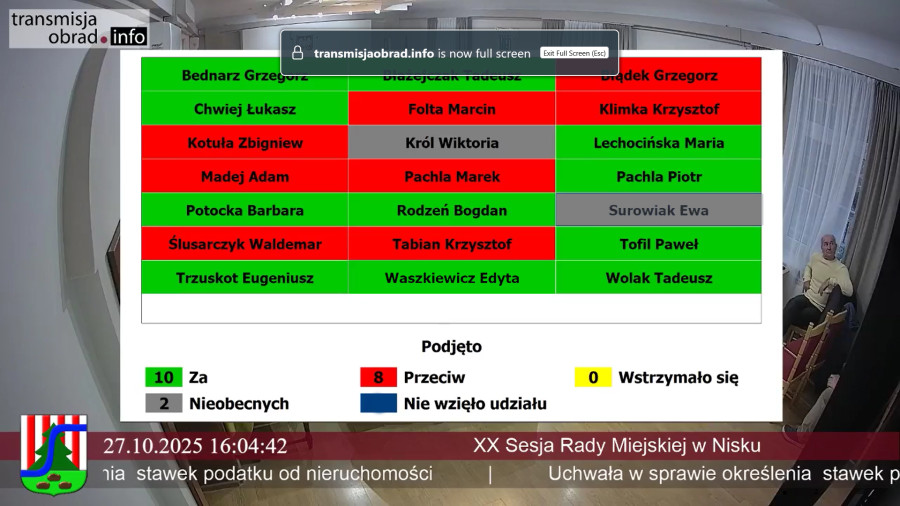 Podczas XX Sesji Rady Miejskiej w Nisku, która odbyła się 27 października 2025 roku, radni debatowali nad projektem uchwały w sprawie określenia stawek podatku od nieruchomości na rok 2026. Po burzliwej dyskusji uchwała została przyjęta 11 głosami „za” przy 8 głosach „przeciw”, bez wstrzymujących się.
