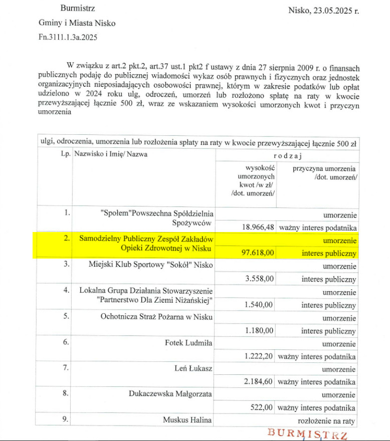 Podczas sesji dyrektor szpitala w Nisku przyznał, że w jego przypadku oznacza to wzrost obciążeń o około 20 tys. zł rocznie. Jednak nie zaznaczył, że w poprzednich latach podatek ten szpital miał umarzany. Tylko w 2024 roku umorzono 97 618 zł z tytułu ważnego interesu publicznego (pełny wykaz umorzeń dostępny jest TUTAJ lub w BIP Urzędu Miasta i Gminy Nisko).