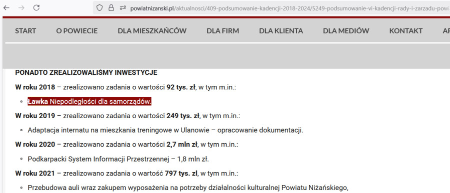 Choć ławka powstała z publicznych pieniędzy, dziś, po siedmiu latach, trudno znaleźć w dokumentach powiatu niżańskiego jakiekolwiek informacje o tym projekcie. Na oficjalnych stronach starostwa powiatowego w Nisku nie ma śladu ani po ławce. Jedyna wzmianka pojawia się w podsumowaniu VI kadencji Rady Powiatu (2018–2024), gdzie projekt wymieniono jako sukces 2018r. bez dalszych szczegółów.
