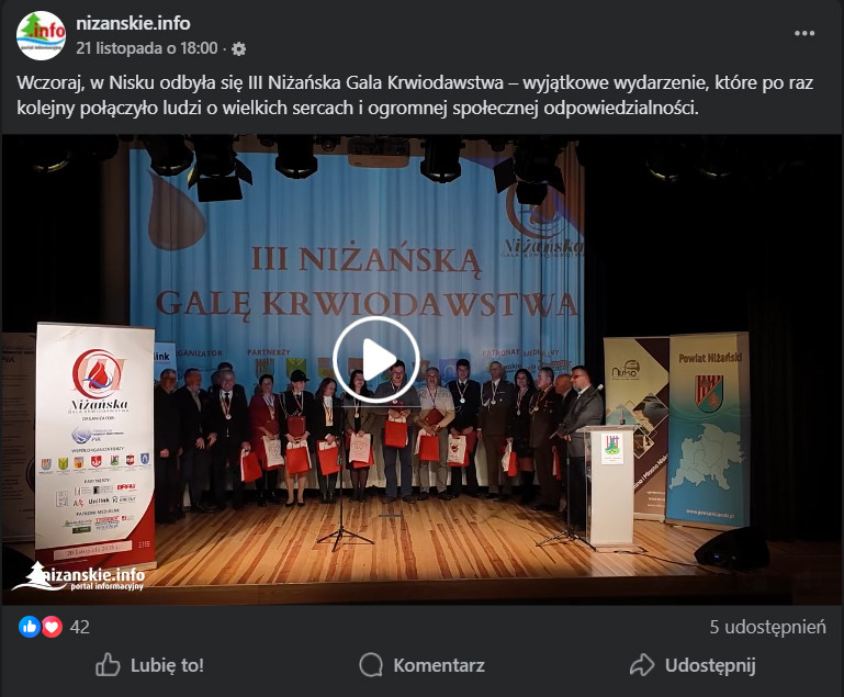 Gala była również okazją do zaprezentowania dorobku całego roku. W 2025 roku na terenie powiatu niżańskiego zorganizowano dziewięć cywilnych akcji krwiodawstwa, podczas których mieszkańcy oddali ponad 40 litrów krwi. Mobilne punkty poboru odwiedziły m.in.: