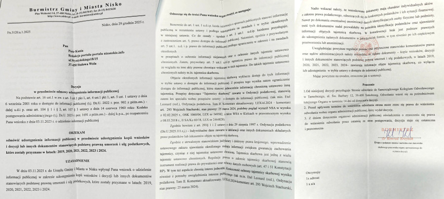 Decyzją z 29 grudnia 2025 r. Burmistrz Niska odmówił udostępnienia żądanych dokumentów. W uzasadnieniu wskazano, że kopie wniosków, decyzji i innych dokumentów stanowiących podstawę umorzeń podatkowych objęte są tajemnicą skarbową, a nawet po anonimizacji mogłyby prowadzić do pośredniej identyfikacji podatników. Zdaniem urzędu oznacza to całkowite wyłączenie tych dokumentów z dostępu w trybie ustawy o dostępie do informacji publicznej.