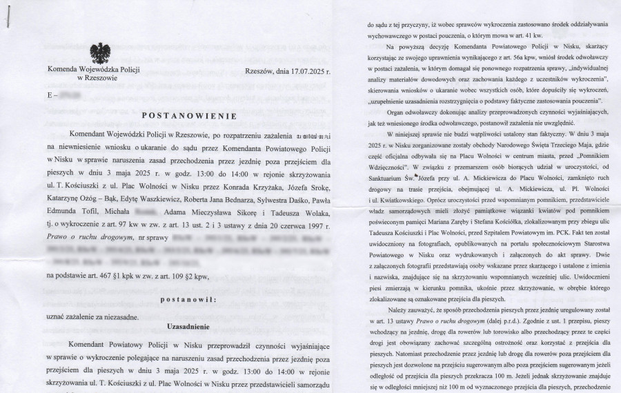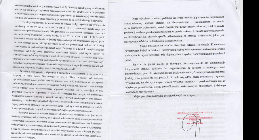 Zażalenie na decyzję o środku karnym jako pouczeniu nie zostało jednak uwzględnione pomimo, że zastosowana podstawa prawna nie przewiduje w ogóle pouczenia, a jedynie karę grzywny lub nagany, nie pouczenia. Komendant Wojewódzki Policji w Rzeszowie uznał, że zastosowanie pouczenia mieściło się w granicach obowiązujących przepisów i było dopuszczalne w świetle zasad prawa wykroczeń. W uzasadnieniu wskazano, że czynności wyjaśniające przeprowadzono prawidłowo, a okoliczności zdarzenia nie wymagały skierowania sprawy do sądu.