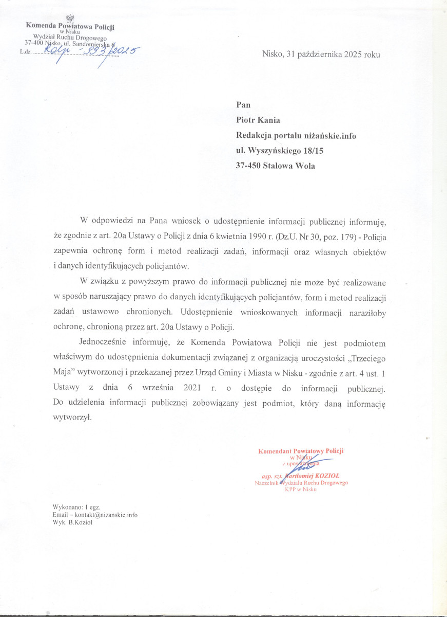 Równolegle redakcja portalu nizanskie.info wystąpiła do Komendy Powiatowej Policji w Nisku z wnioskiem o udostępnienie informacji publicznej dotyczących zabezpieczenia uroczystości z 3 Maja 2025r. Wniosek obejmował m.in. plan działań Policji oraz dokumentację organizacyjną wydarzenia. Chcemy się zwyczajnie dowiedzieć, które ulice były zabezpieczone w jakim okresie i przez jakie służby.