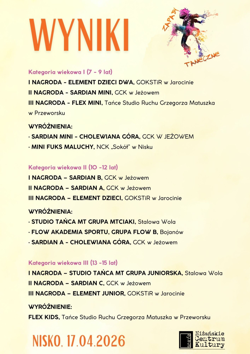 W piątek, 17 kwietnia, hala sportowa Zespołu Szkolno-Przedszkolnego nr 3 w Nisku wypełniła się setkami młodych tancerzy, którzy do Niska zjechali się na kolejną edycję „Zapasów Tanecznych”, wydarzenia, które przyciągnęło grupy taneczne z całego regionu. Organizatorem wydarzenia było Niżańskie Centrum Kultury „Sokół” w Nisku.
