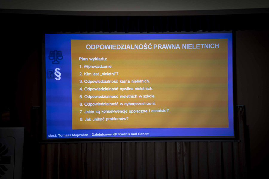 Podczas wystąpienia omówił on najważniejsze aspekty odpowiedzialności karnej, cywilnej i szkolnej, a także poruszył temat cyberprzestrzeni. Miejsca, w którym młodzi ludzie często zapominają, że obowiązują ich te same zasady co w świecie rzeczywistym.