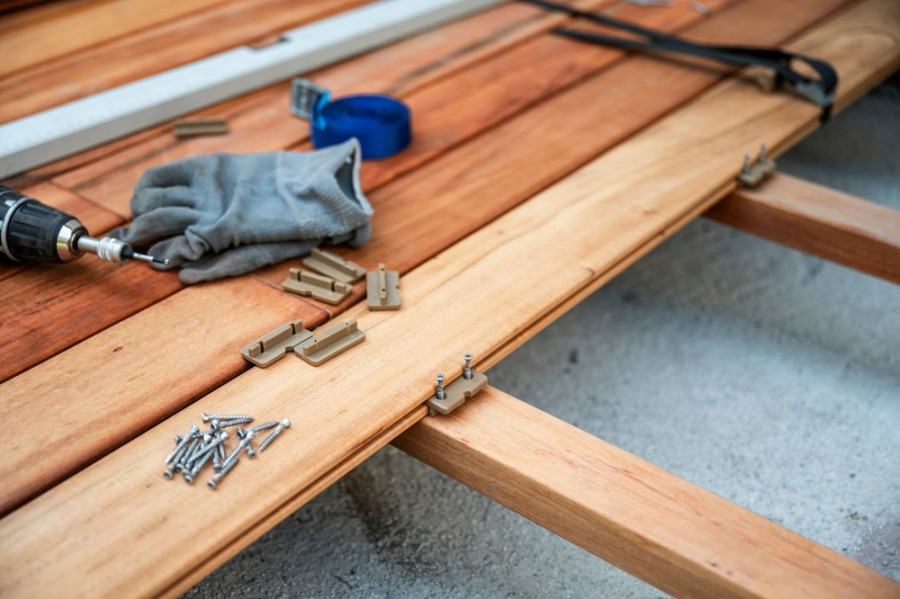 Najczęstsze problemy tarasów wynikają z błędów w konstrukcji nośnej. Podstawą są legary odpowiednio dobrane do warunków technicznych i spadek ok. 1-2%, który ogranicza zaleganie wody na powierzchni tarasu i w szczelinach między deskami. Równie istotne są elementy mocujące - wkręty, łączniki, kotwy i systemy montażowe. Powinny być odporne na korozję i dopasowane do rodzaju drewna, ponieważ mają bezpośredni wpływ na stabilność konstrukcji i trwałość połączeń. W Drewnotex dostępne są akcesorie renomowanych producentów, co ułatwia skompletowanie spójnego i bezpiecznego systemu montażu. Przy wysokich wymaganiach estetycznych warto wybrać system ukrytego mocowania - bez widocznych wkrętów, co pozwala uzyskać jednolitą i nowoczesną powierzchnię tarasu.